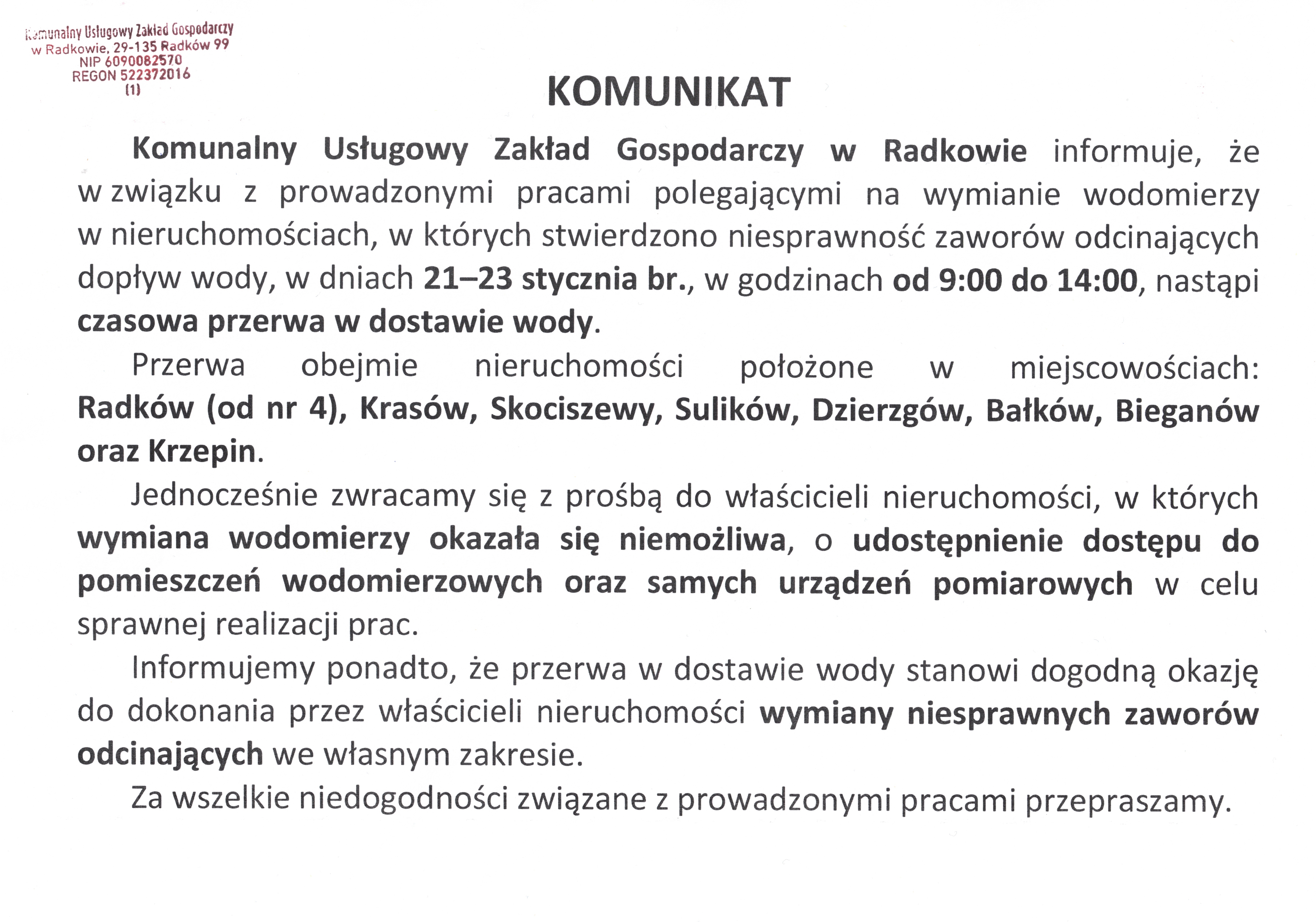 KOMUNIKAT - przerwy w dostawie wody